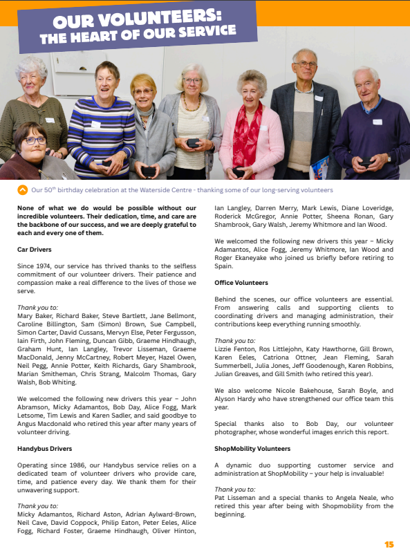 I want to thank all of our volunteer car drivers, volunteer bus drivers and not least the team of trustees so ably led by Brien Beharrell who provides me with first class support based on her very considerable experience within business and a clear perspective of how communities tick in Newbury and West Berkshire.
